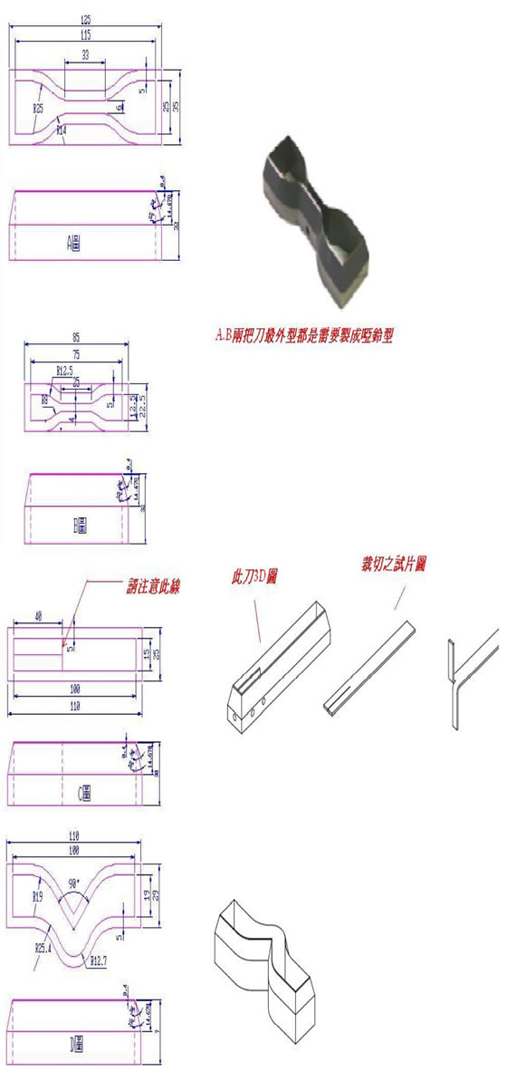 裁高样式:哑铃型裁刀1~4号刀、新月型撕裂裁刀、裤型撕裂裁刀、TR 实验裁刀。包含国 标、ASTM 标准、ISO 标准,或客户订制尺寸。